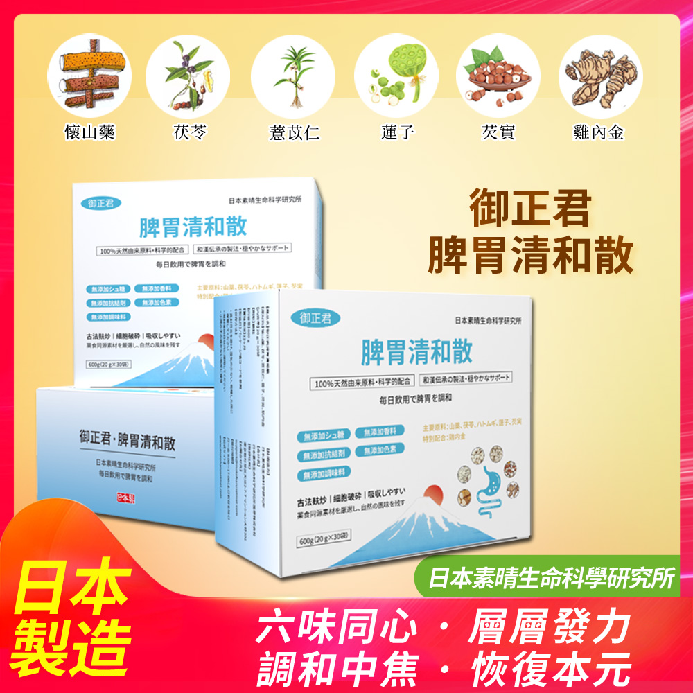 日本原裝進口|御正君脾胃清和散,日本素晴生命科學研究所匠心研發!遵循君臣佐使組方智慧,懷山藥、茯苓、薏苡仁等六味天然食材協同增效,補脾益氣、健脾祛濕、化積導滯,深層調理腸胃功能,改善各類腸胃不適,日本製造品質保障,溫和養護脾胃健康!